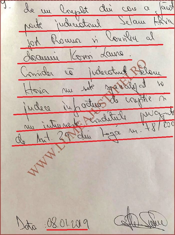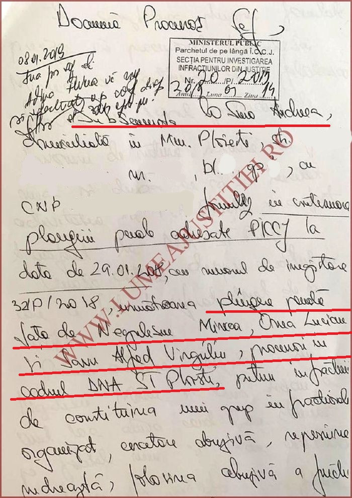 Documentele publicate mai sus sunt cuprinse in dosarul nr. 20/P/2019, deschis in urma unei plangeri penale formulate de Andreea Cosma, in care reclama chiar lipsa de specializare in fapte de coruptie a judecatorului Horia Valentin Selaru. Concret, deputata Andreea Cosma a depus in 8 ianuarie 2019 o plangere penala impotriva procurorilor Mircea Negulescu, Lucian Onea si Savu Alfred din DNA Ploiesti pentru constituirea unui grup infractional organizat, cercetare abuziva, represiune nedreapta si folosirea abuziva a functiei, reclamand modalitatea in care acestia au inteles sa efectueze urmarire penala in dosarul „Ciuperceasca”, dar si faptul ca paraditorii de la DNA Ploiesti au facut presiuni asupra sa pentru a lua parte la inscenarea si arestarea unor oameni. Refuzand insa acest lucru, Andreea Cosma a fost trimisa in cateva zile in judecata, cauza fiind inregistrata pe rolul Inaltei Curti de Casatie si Justitie, la completul format din judecatorii Horia Valentin Selaru (fost procuror si consilier al Laurei Kovesi), Francisa Vasile si Daniel Gradinaru.
