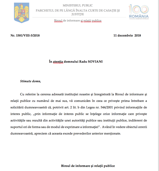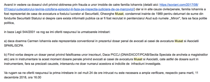 Fac precizarea că în data de 10 decembrie 2018 (în urmă cu 4 luni) am adresat următoarea întrebare domnului Augustin Lazăr (emailul meu în original, mai jos): ,,Având în vedere că (…) familia Iohannis a fost reprzentată de casa de avocatură a fostului lucrător al Securității, Gheorghe Mușat, condamnat înainte de 1989 pentru deturnare de sume din fondurile Securității Statului și despre care există informații publice că ar fi fost recrutat în penitenciarul Aiud sub numele ,,Miron”, fără să facă poliție politică, vă rog să îmi comunicați: a) ,,dacă doamna Carmen Iohannis este reprezentată convențional în prezentul dosar penal de avocați ai casei de avocatură Mușat și Asociații SPARL/SCPA.