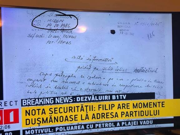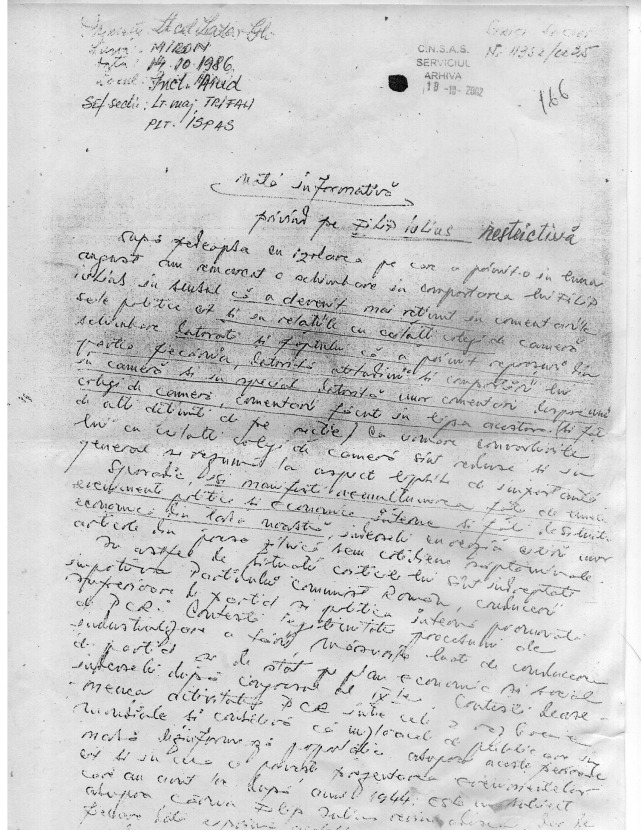 Textul informării (publicat pentru prima dată AICI, provine din dosarul de urmărire informativă ,,obiectiv FODOR”, făcut de Securitate lui Iulius Filip. Iată și textul, din 14 octombrie 1986.