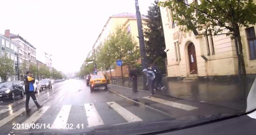 La Cluj, imaginile suprinse de camera de bord a unui participant la trafic arată un tânăr izbit în plin pe trecerea pentru pietoni și proiectat pe trotuar, lângă un stâlp.