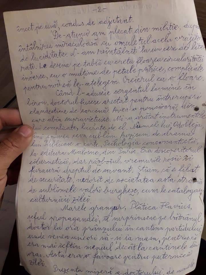 Mi-a arătat instrumentele lui complicate, lucrate de el. Numele lui, Odobleja îmi spunea ceva sublim. Auzisem de drama lui. Publicase o carte, Psihologia consonantistă la editura Maloine, din Paris. Era descoperitorul ciberneticii, dar războiul, vremurile roșii îi furaseră dreptul de savant. Știam că este filat de securitate, nedorit de societatea asta străină de sublimele valori burgheze, cum catalogau culturnicii zilei.