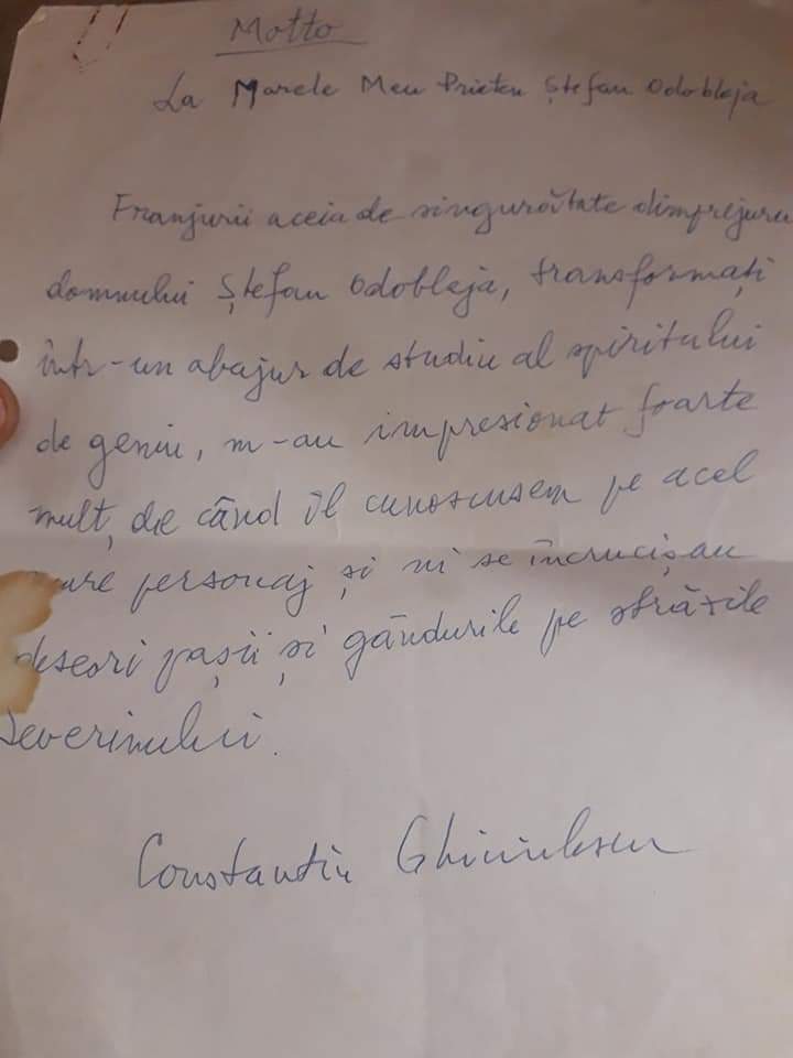 Franjurii aceia de singurătate dimprejurul domnului Ștefan Odobleja, transformați într-un abajur de studiu al spiritului de geniu, m-au impresionat foarte mult, de când îl cunoscusem pe acel mare personaj și ni se încrucișau adeseori pașii și gândurile pe străzile Severinului.