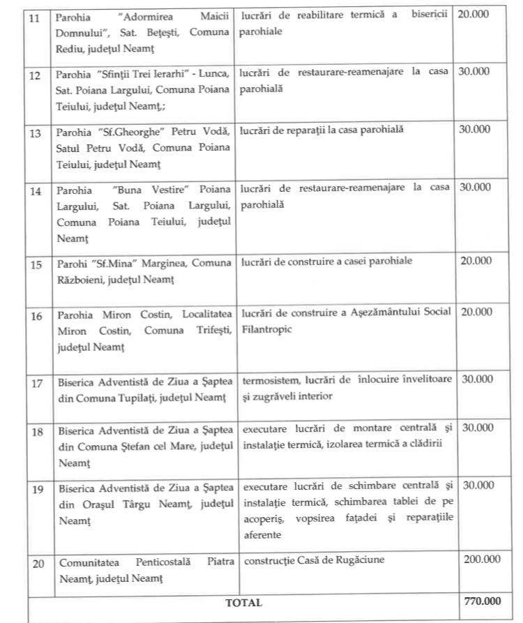 - Parohia Sf. Ilie din Târgu Neamț– 30.000 lei pentru lucrări de reparații și modernizare a clădirii cu sala de mese și a capelei