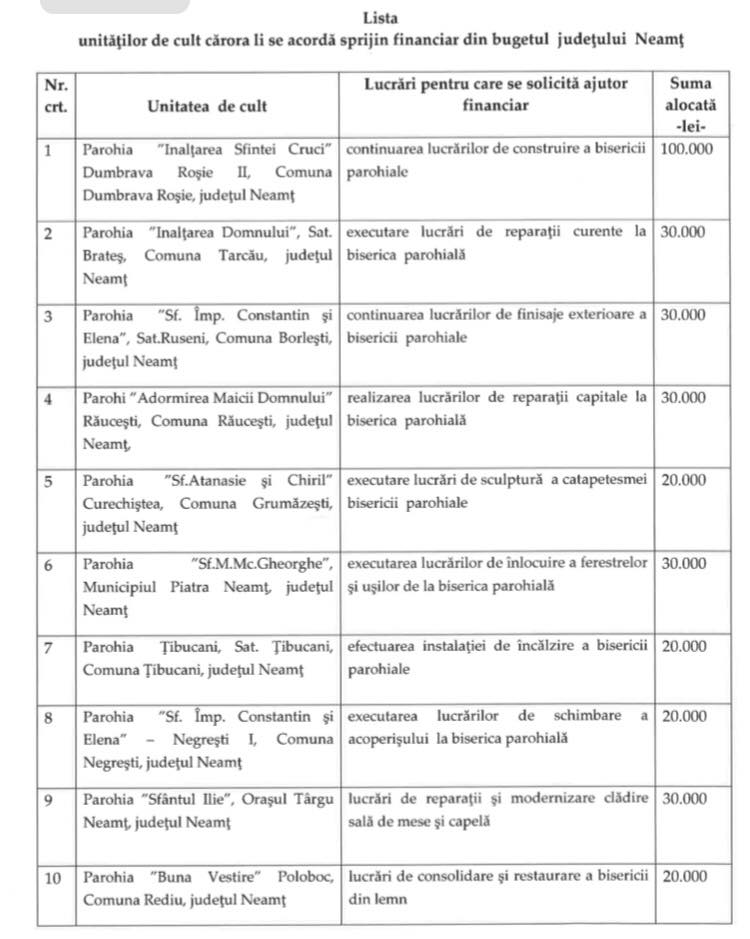 Lista complete a unităților de cult din județ care primesc sprijin de această dată din partea CJ Neamț o puteți vizualiza mai jos.
