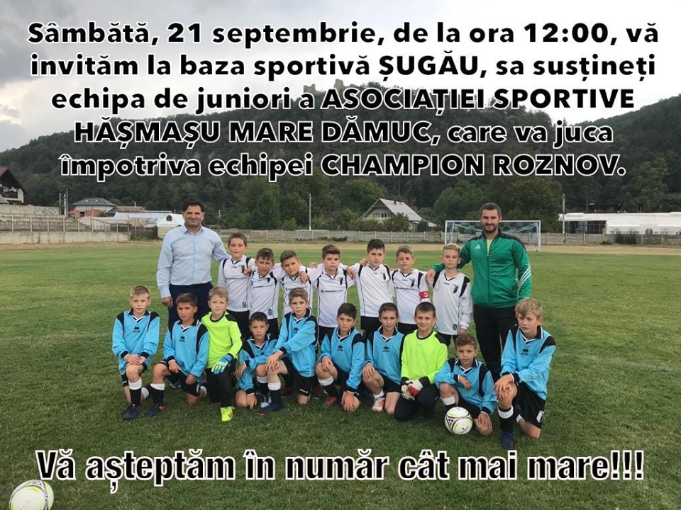 Sâmbătă, 21 septembrie 2019, de la ora 12,00, sunteți invitați la Baza Sportivă Șugău, să susțineți echipa de juniori a Asociației Sportive Hășmășu Mare Dămuc, care va juca împotriva echipei Champion Roznov.
