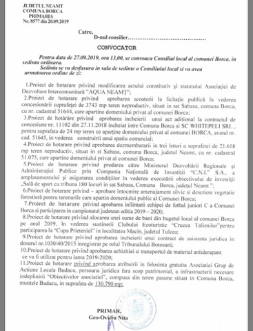 Se convoacă în ședința ordinară, Consiliul local al comunei Borca, azi, 27 septembrie 2019, ora 13,00.