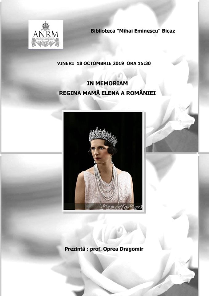 Actualitate În memoriam Regina Mamă Elena a României, activitate la Bicaz De către admin - 0 736 Vineri, 18 octombrie, ora 15,30, la Biblioteca Mihai Eminescu Bicaz, va avea loc o activitate „În memoriam Regina Mamă Elena a României”. Prezintă profesorul Oprea Dragomir. Sursa: ZiarBicaz.RO