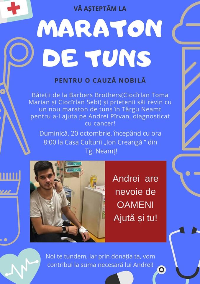 De asemenea, duminică, 20 octombrie, la ora 08:00, în incinta Casei de Cultură din Târgu Neamț, alți oameni buni, băieții de la Barbers Brothers, își vor face meseria de frizer, iar dumneavoastră puteți dona pentru tânărul Andrei.