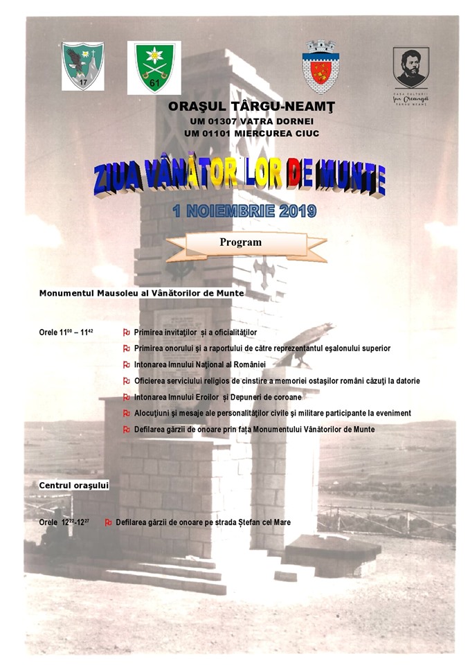 Pe 1 noiembrie, în orașul Tîrgu Neamț vor avea loc manifestări dedicate sărbătoririi Zilei Vânătorilor de Munte la Monumentul Mausoleu al Vânătorilor de Munte. Evenimentul se va încheia cu defilarea gărzii de onoare pe strada Ștefan cel Mare din centrul orașului