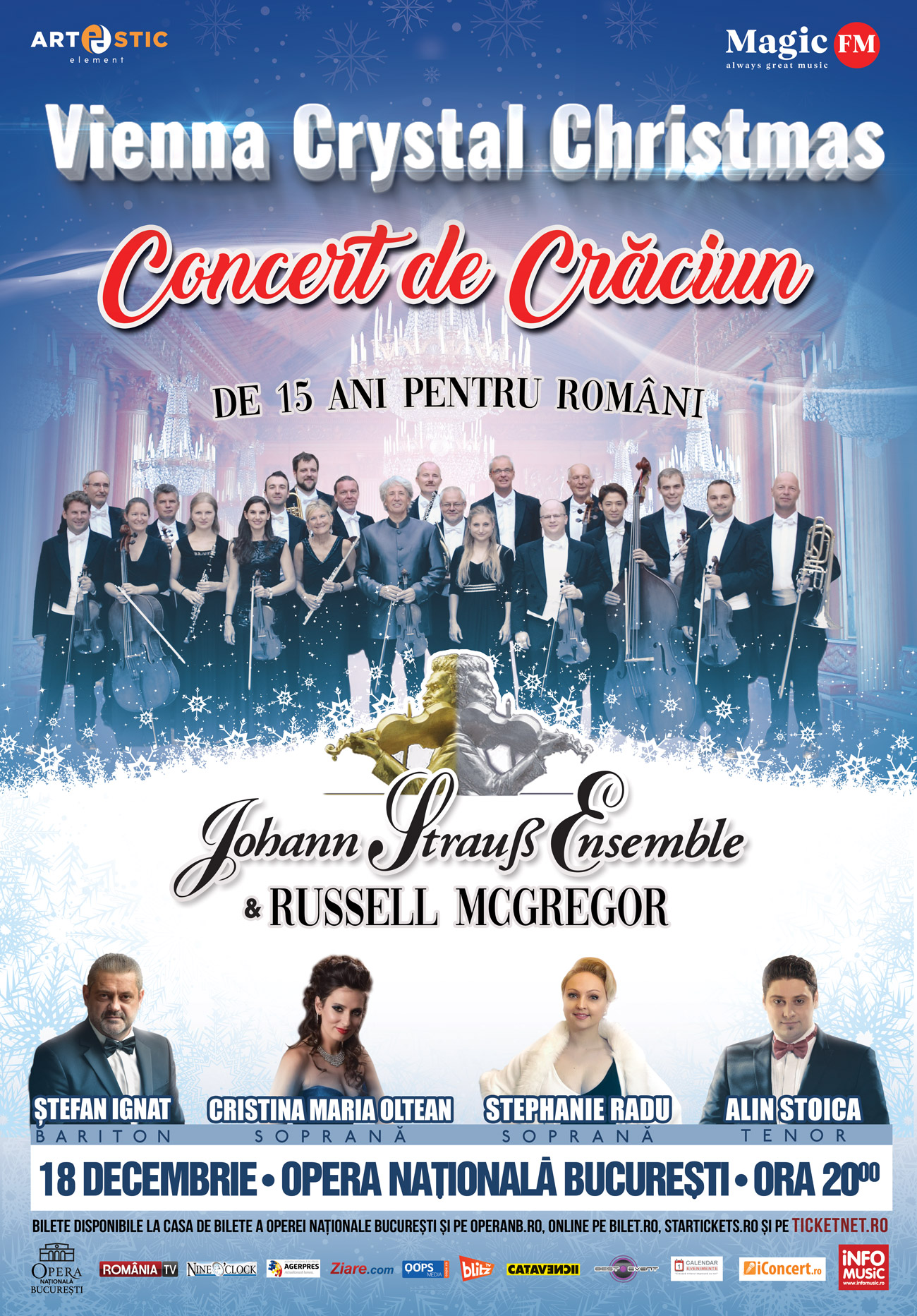 Baritonul Ștefan Ignat, tenorul Alin Stoica și sopranele Cristina Maria Oltean și Stephanie Radu vor evolua în acompanimentul orchestrei Johann Strauss Ensemble, pe scena Operei Naționale Române din București, în data de 18 decembrie, iar renumita soprană de origine austriacă, Elisabeth Wimmer va fi parte din programul concertelor prezentate în celelalte orașe din cadrul turneului național.