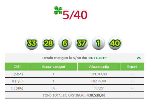 La tragerea Loto 5/40 de joi, 14 noiembrie 2019, s-a câștigat premiul de categoria I, în valoare de 349.914,40 lei. Pe biletul norocos, jucat la agenția 27-022 din Târgu Neamț, județul Neamț, au fost jucate, în total, 14 variante la Loto 5/40 și 1 variantă la Super Noroc.