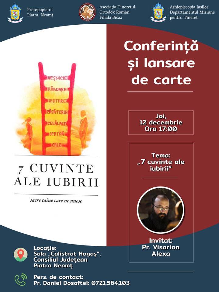 Protopopiatul Piatra Neamț, ATOR Bicaz și Arhiepiscopia Departamentul Misiune pentru tineret organizează, joi, 12 decembrie, ora 17,00, o conferință și lansare de carte, cu tema „7 cuvinte ale iubirii”, invitat special Pr. Visarion Alexa.