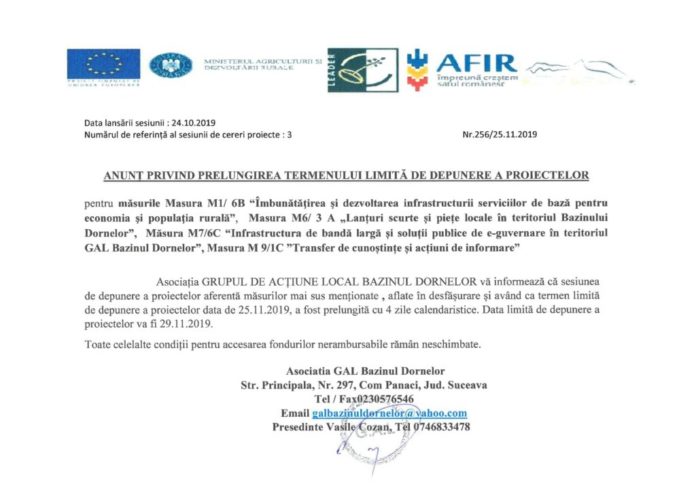 GAL Bazinul Dornelor – Anunț privind prelungirea termenului limită de depunere a proiectelor