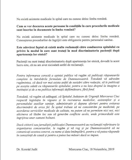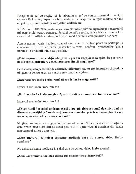 Rezumând, prin adresa prezentată, conducerea spitalului comunică opiniei publice, sub semnătură oficială, că interviurile realizate în cadrul concursurilor de ocupare a posturilor vacante se realizează în limba română, respectiv că la nivelul spitalului nu există asistente care să nu cunoască deloc limba română.