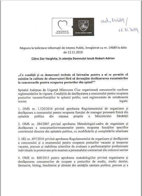 Pentru a asigura informarea corectă și echidistantă a cititorilor noștri, revenim, așa cum am promis, asupra subiectului privind concursurile de ocupare a posturilor vacante din cadrul Spitalului Județean de Urgență Miercurea Ciuc, cu punctul de vedere oficial al managerului unității, dr. Konrad Judit, care a răspuns setului de întrebări transmis de Ziar Harghita, prezentat, în integralitate, aici.