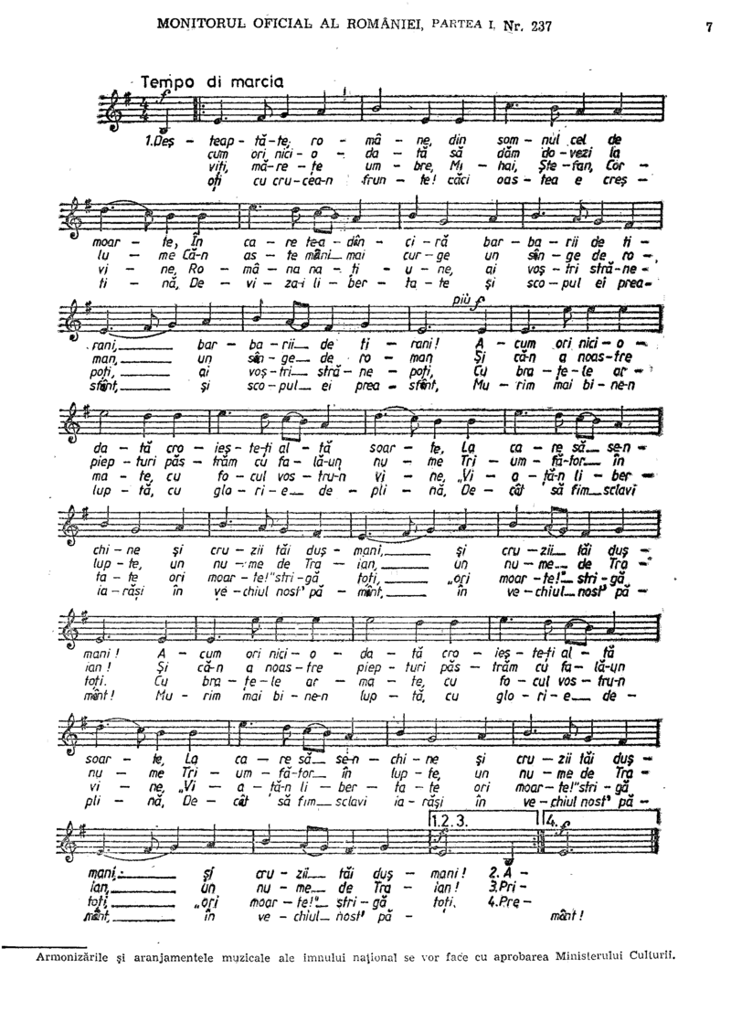 Imnul de stat al României este alcătuit din unsprezece strofe. La ocazii festive se interpretează strofele 1, 2, 4 și 11.
