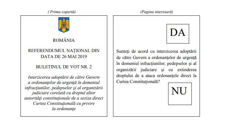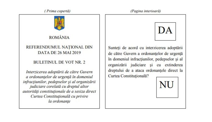 REFERENDUM 2019: ”Sunteți de acord cu interzicerea adoptării de către Guvern a ordonanțelor de urgență în domeniul infracțiunilor, pedepselor și al organizării judiciare și cu extinderea dreptului de a ataca ordonanțele direct la Curtea Constituțională?” A întrebat Iohannis, susținut frenetic de PNL. 85% dintre votanți au zis să NU se mai dea ordonanțe de urgență pe zona infracțiunilor, pedepselor și a organizării judiciare.