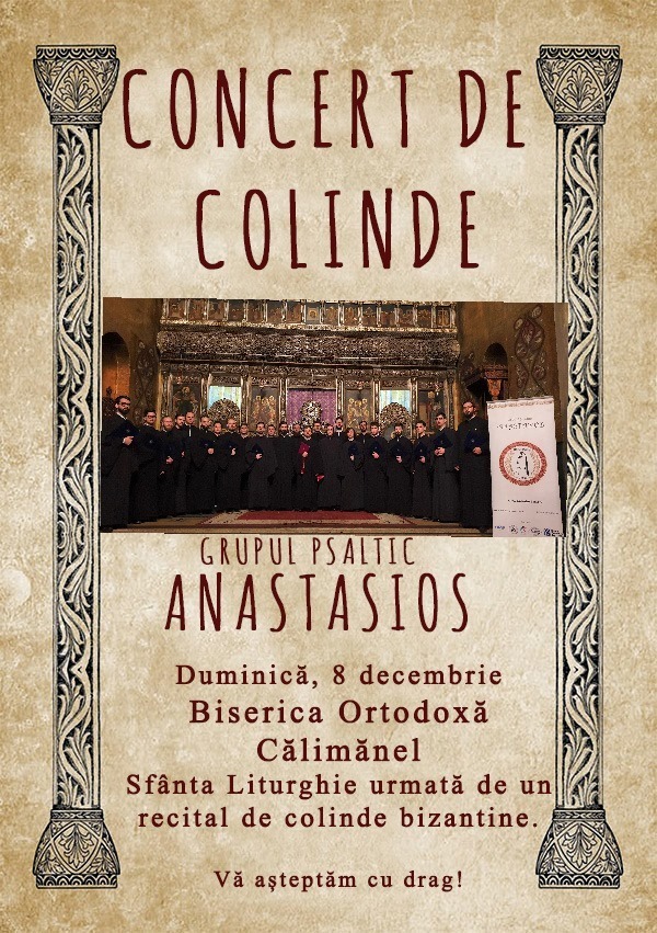 După Sfânta Liturghie, în Biserica Ortodoxă Călimănel, credincioși vor putea asculta un concert de colinde religioase ortodoxe susținut de Grupul Psaltic ANASTASIOS.