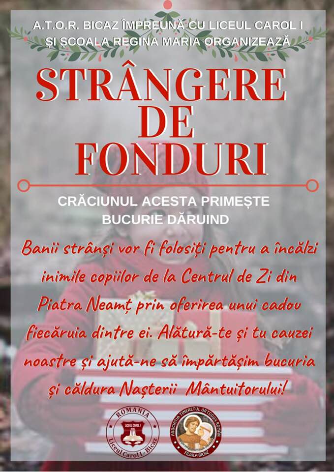 Ator Bicaz împreună cu Liceul Carol I și Școala Regina Maria organizează „Strângere de fonduri”-Crăciunul acesta primește bucurie dăruind. Banii strânși vor fi folosiți pentru a încălzi inimile copiilor de la Centrul de zi din Piatra Neamț prin oferirea unui cadou fiecăruia dintre ei.