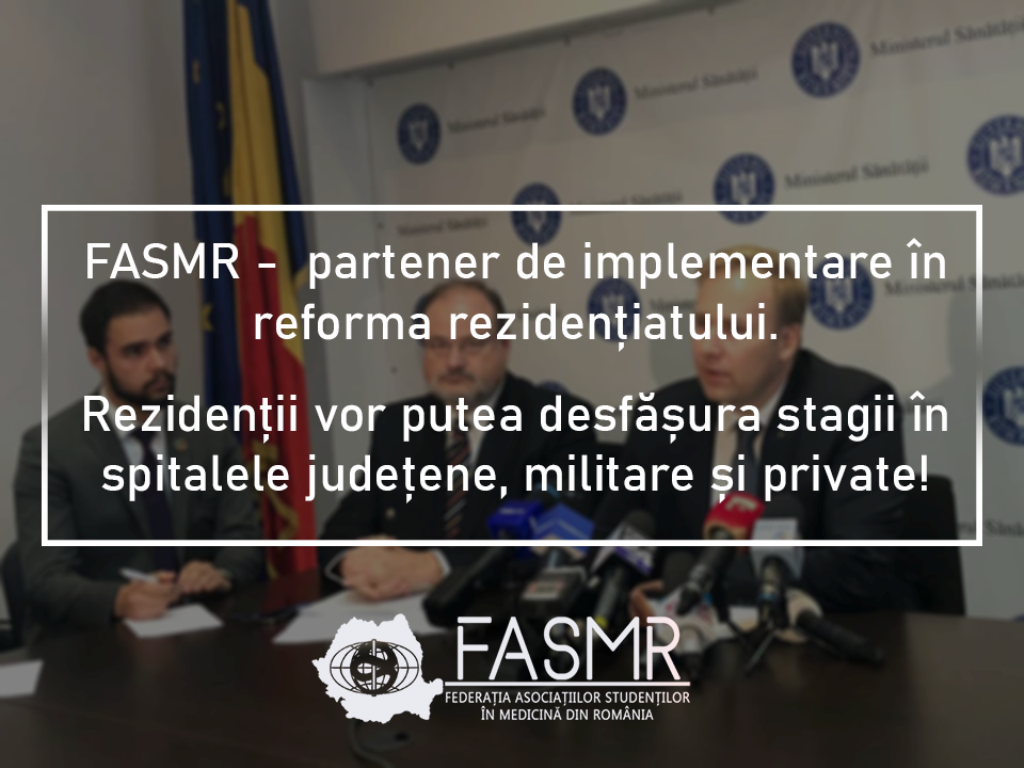 Federația Asociațiilor Studenților în Medicină din România susține inițiativa Ministerului Sănătății de a moderniza rezidențiatul, devenind un partener de implementare. În perioada imediat următoare, se va constitui un grup de lucru în cadrul Ministerului Sănătății la care vor participa în permanență reprezentanți mandatați ai studenților și rezidenților, pentru a ajunge la un rezultat cât mai bun în urma acestei măsuri. Scopul nostru este stabilizarea unui sistem de sănătate cât mai performant pentru un viitor profesional de calitate al tinerilor medici.
