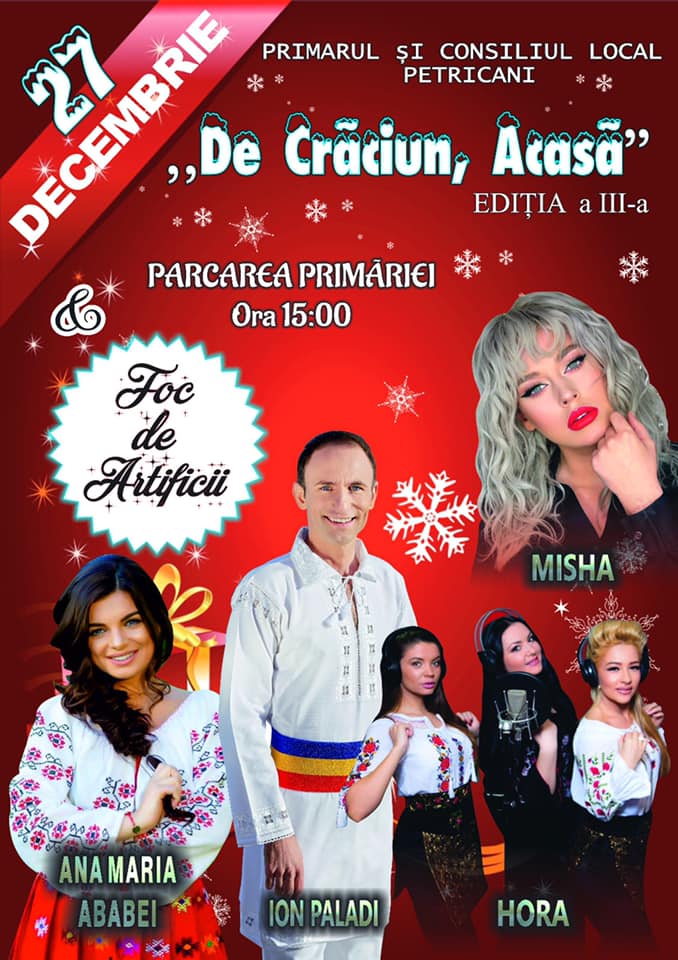 Primarul și Consiliul Local al comunei Petricani organizează pe 27 decembrie, în parcarea Primăriei, începând cu ora 15.00, evenimentul „De Crăciun, acasă”. Evenimentul ajuns la a treia ediție îi va avea ca invitați pe Misha, Ana Maria Ababei, Ion Paladi, Hora și se va încheia cu un spectaculos foc de artificii.