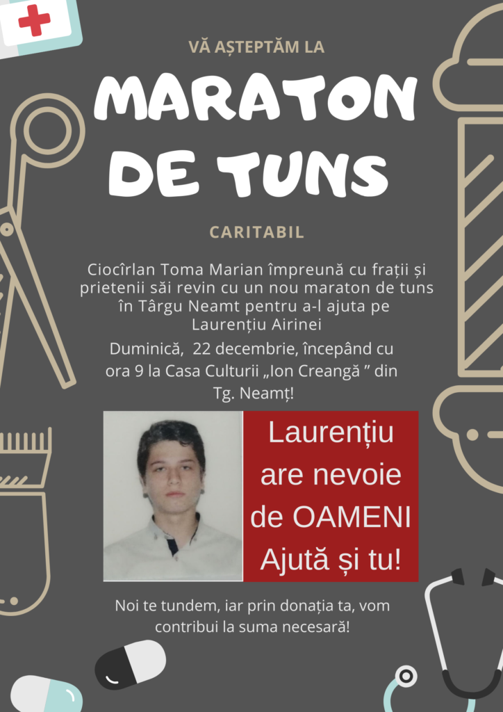 O nouă ediție a „Maratonului de tuns” caritabil organizată de Ciocîrlan Toma Marian, împreună cu frații și prietenii săi, are ca scop sprijinirea lui Laurențiu Airinei.