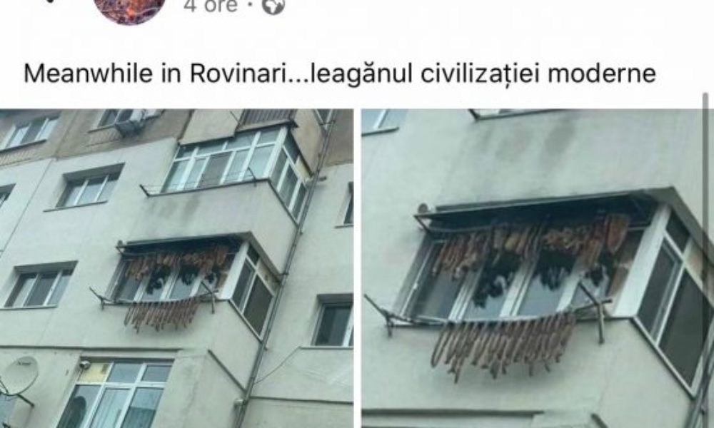 Proprietarii unui apartament din Rovinari, județul Gorj au pus la uscat cârnații și slănina, pe sârme, pe balcon și în afara balconului. Imaginile postate de trecători pe rețelele sociale au devenit virale. „Meanwhile în Rovinari… leagănul civilizației moderne”, a scris internautul care a postat imaginile pe Facebook. (Alexandru Visan).