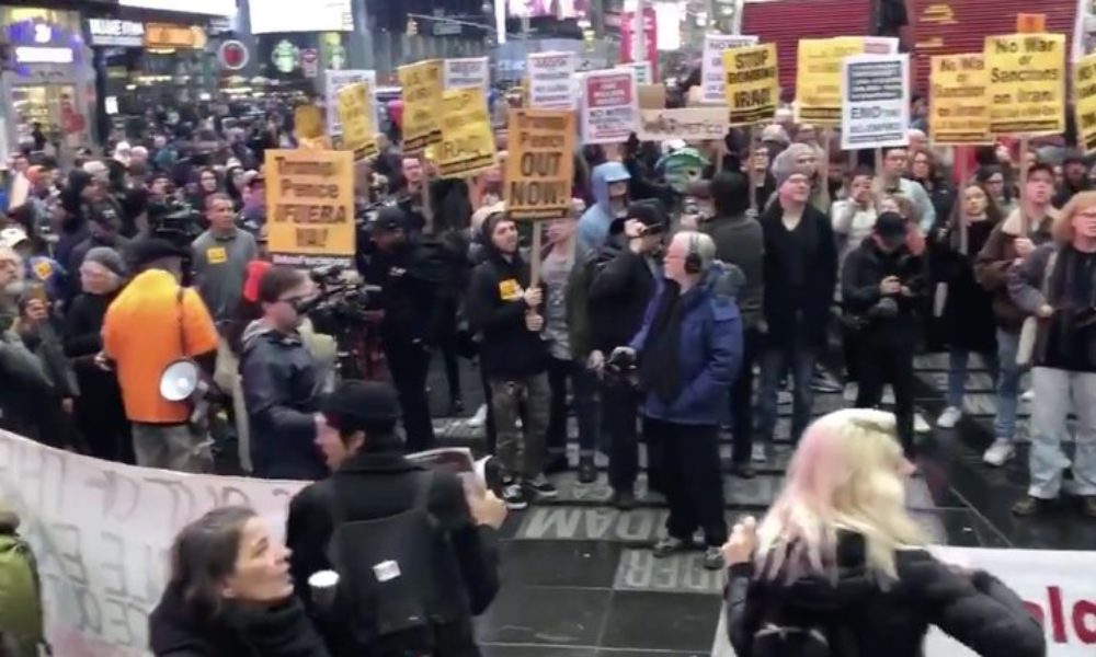 Câteva sute de manifestanți s-au adunat sâmbătă în Times Square scandând „Fără dreptate, nicio pace, SUA din Orientul Mijlociu!”