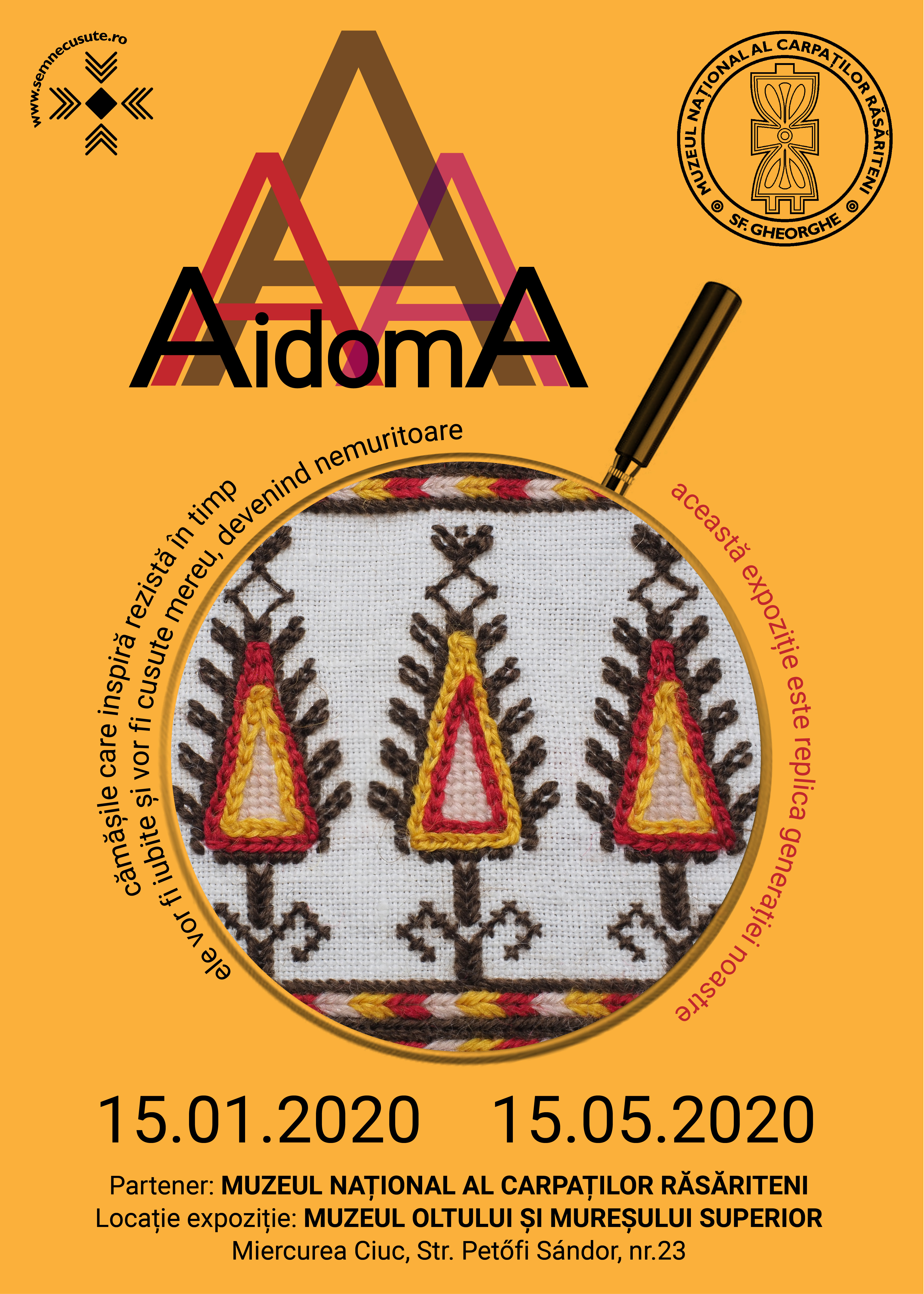 - miercuri 15 ianuarie, ora 16⁰⁰- vernisajul expoziției AIDOMA. Expoziția, realizată de Asociația Culturală ,,Semne cusute”, aduce în atenția publicului o colecție cu reconstituiri ale unor cămăși femeiești reprezentând ia tradițională. Colecția de cămăși pe lângă bogăție, diversitate și frumusețe înseamnă și o adevărată arhitectură ce combină izvoade, modele, simbolistică și reprezentări ale mărcii noastre identitare și pune în evidență tehnici de croi, cusut, brodat, materiale și cromatică specifice artei noastre populare românești din diferite zone etnofolclorice ale țării.