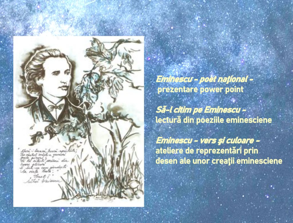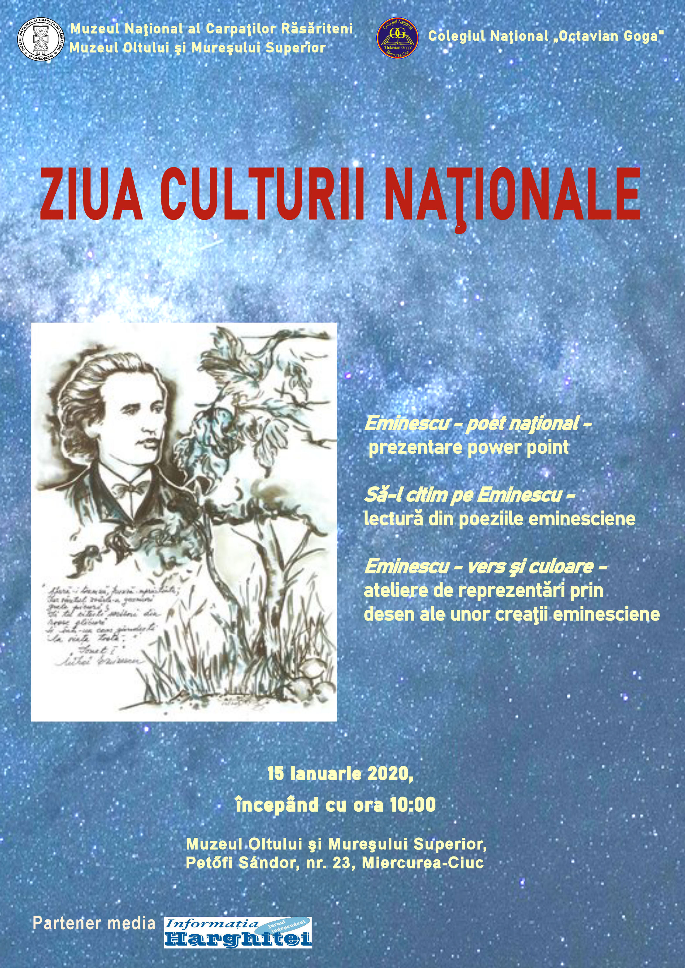 - miercuri, 15 ianuarie, începând cu ora 10⁰⁰– Eminescu – poet național – prezentare power point; Să-l citim pe Eminescu – lectură din poeziile eminesciene; Eminescu – vers și culoare – ateliere în cadrul cărora participanții vor transpune în desen versuri ale poetului. Activități organizate în colaborare cu Colegiul Național ,,Octavian Goga” din Miercurea Ciuc.
