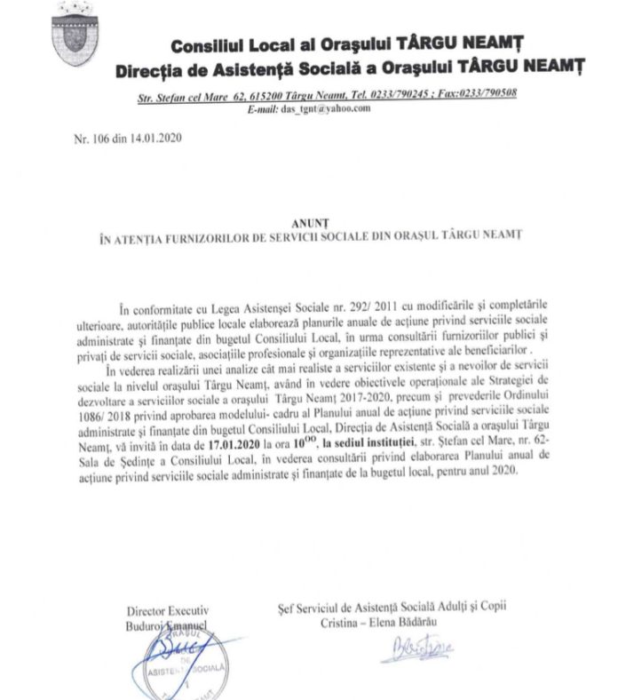 Furnizorii de servicii sociale din Târgu Neamț, chemați la consultări