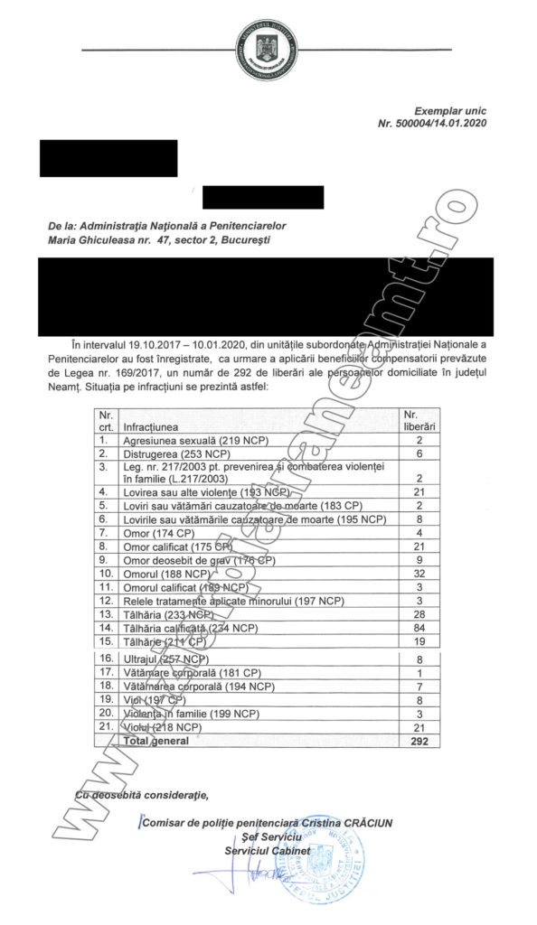 Iată lista cu numărul de infractori nemțeni eliberați înainte de termen și cu faptele pentru care au fost încarcerați: