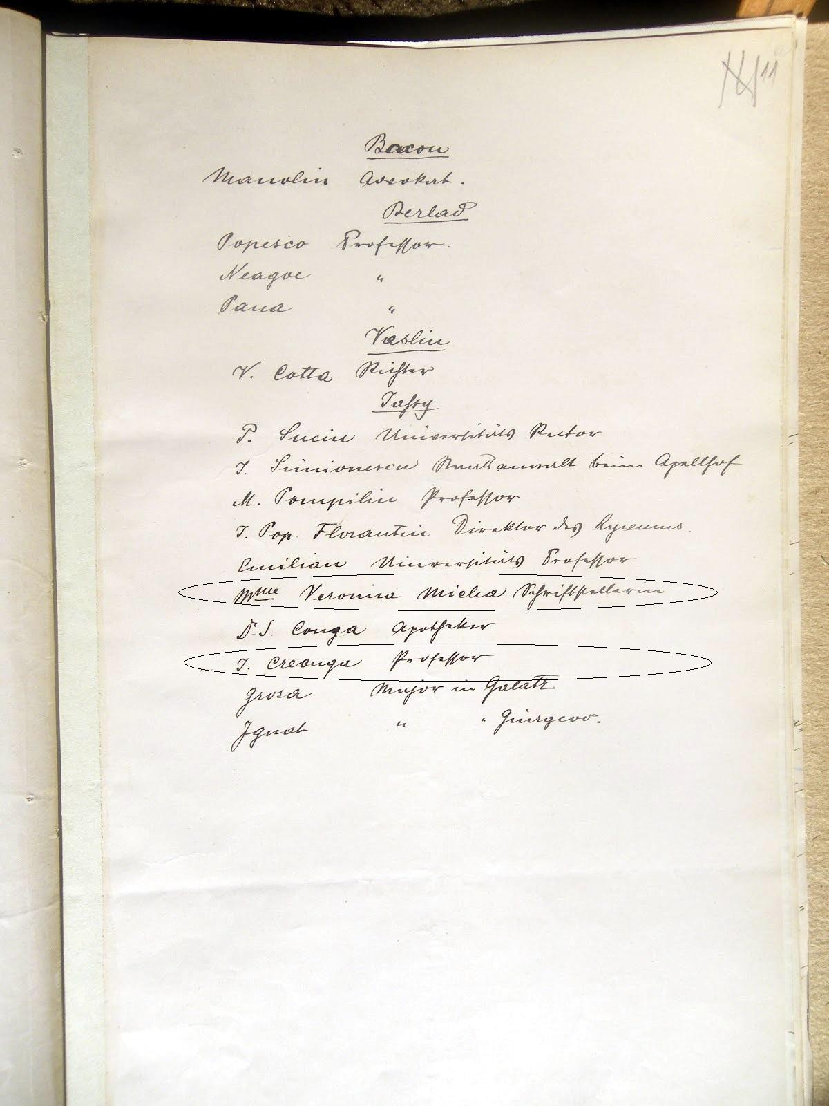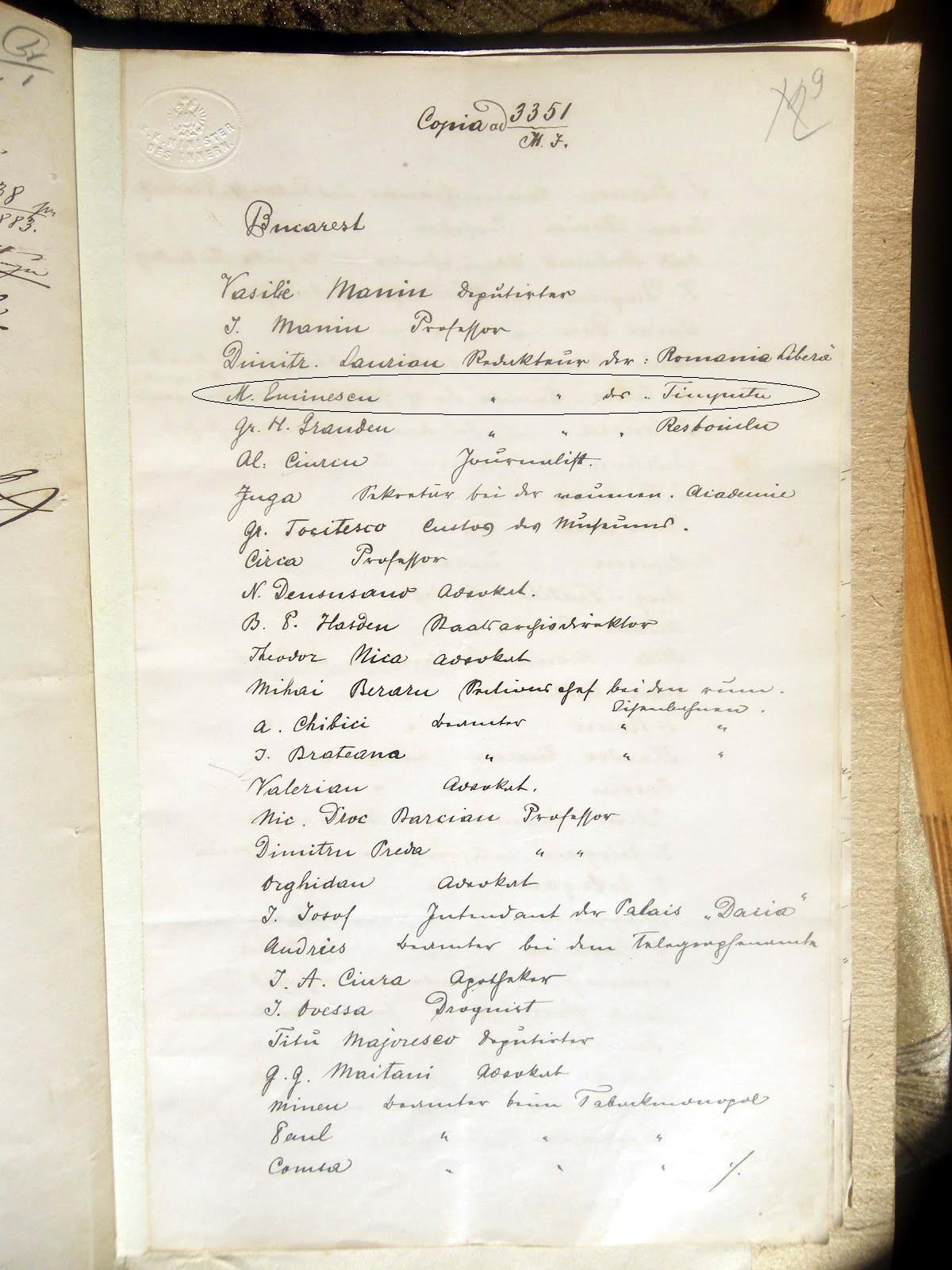 Al patrulea în lista anexată scrisorii este arătat „M. Eminescu, redactor la „Timpul”, alături de care îi întâlnim şi pe Dimitrie Laurean („redactor la „România liberă”), Al. Ciurea ( „jurnalist”), B.P. Haşdeu ( „director al Arhivelor Statului”), A. Chibici („funcţionar la Căile Ferate Române”), I. Slavici („profesor”), V. Micle („scriitoare”), V. Maniu („deputat”), T. Maiorescu („avocat”), I. Creangă („profesor”)6… Frumoasă şi simbolică această alăturare de nume!