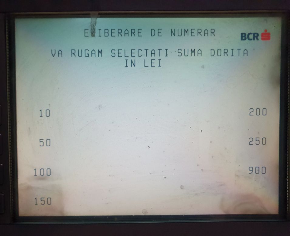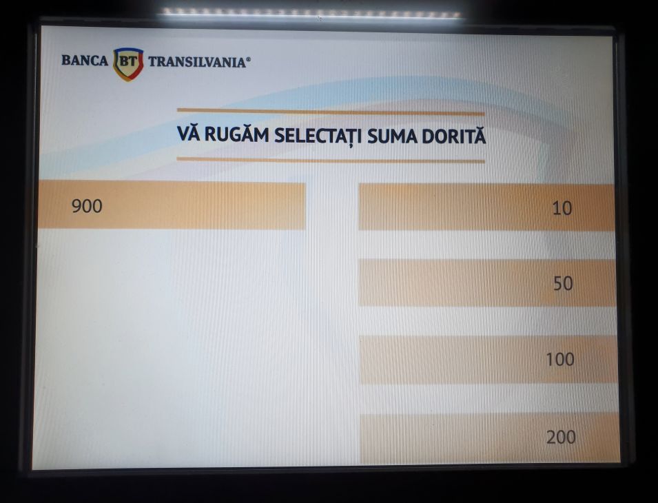 Desigur, nu e scris chiar cu cuvintele astea, dar e formulat frumos și elegant, sub forma unor sume predefinite. Care sume predefinite sunt tot ce-ți oferă acești bancheri prietenoși ca opțiuni de extragere. Tasta aia cu „alegeți altă sumă” a dispărut între timp pe undeva prin vreo gaură neagră a sistemului solar bancar. Dar a dispărut doar pentru cei care au cardul la altă bancă, pentru clienții lor reapare butonul ca prin farmec.