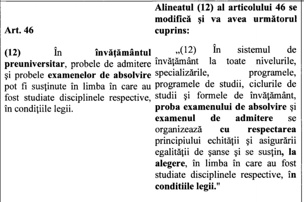 “(12) În sistemul de învățământ la toate nivelurile, specializările, programele, programele de studii, ciclurile de studii și formele de învățământ, proba examenului de absolvire și examenul de admitere se organizează cu respectarea principiului echității și asigurării egalității de șanse și se susțin, la alegere, în limba în care au fost studiate disciplinele respective, conform legii.”