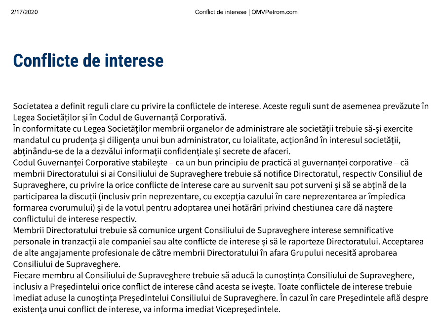 În adresele oficiale ele OMV (vezi mai jos) scrie clar că ”membri organelor de administrare ale societății trebuie să acționeze în interesul societății” iar în legile care reglementează funcționarea Guvernului se spune că secretarii de stat trebuie să acționeze în interesul statului.