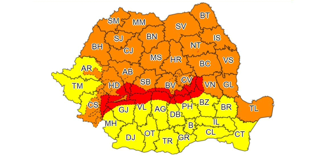 Administraţia Naţională de Meteorologie (ANM) a actualizat, avertizările meteorologice şi a anunţat cod roşu de viscol în Carpaţii Meridionali şi de Curbură. Restul ţării se va afla sub cod galben sau portocaliu de vânt puternic.