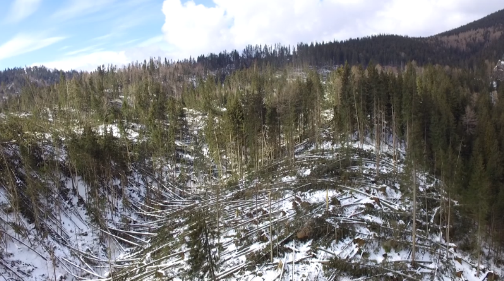 În imaginile aeriene filmate de Zoltan Gyorfy de la Salvamont Mureș se pot observa doborâturile provocate de vântul puternic în zona Ilișoara Mică din Parcul Național Călimani.