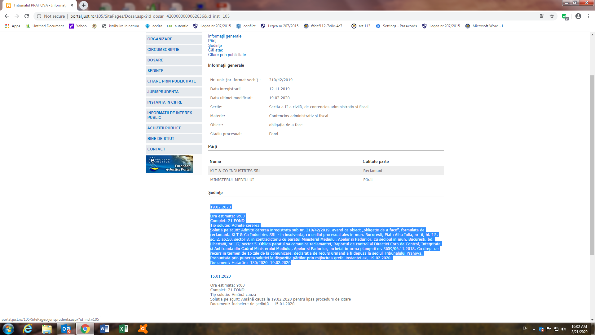 Pe de alta parte, in sedinta de fond din 19 februarie 2020 Tribunalul Prahova a admis cererea societatii KLT&CO Industries SRL cu privire la comunicarea raportului de control al Directiei Corp de Control, Integritate si si Antifrauda din Ministerul Mediului…