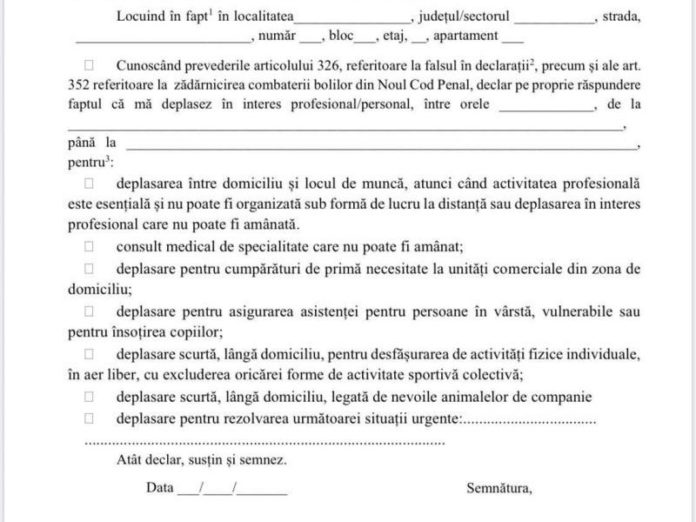 Modelul de formular pe care trebuie să-l completeze românii pentru a putea ieși din casă pe timpul nopții/Documente