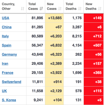 Cu 81.896 de cazuri de infecție COVID, SUA depășit ieri China (81.285). Italia depășește în câteva ore și ea – acum are 80.589 de cazuri.