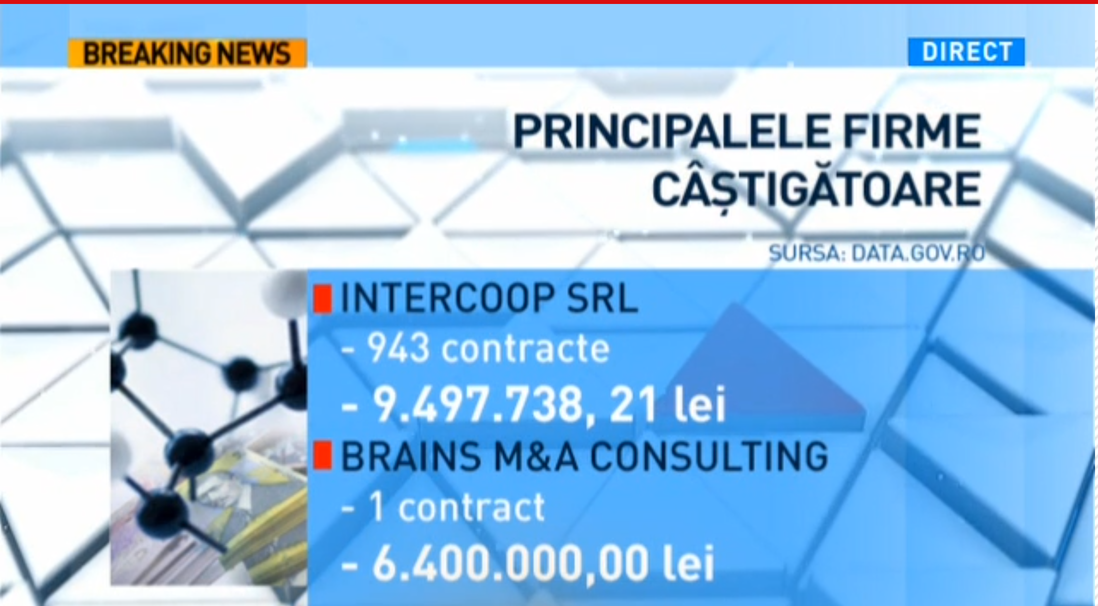 Locul 9 din top era ocupat de micuța firmă de bloc BRAINS M&A CONSULTING. Bomba e că liderul Hexi Pharma ocupa primul loc grație a 141 de contracte diferite, cu 34 de beneficiari diferiți, totalizînd 42 de milioane de lei, în timp ce Brains era în top grație unui unic contract de 6,4 milioane lei, cu un singur beneficiar.