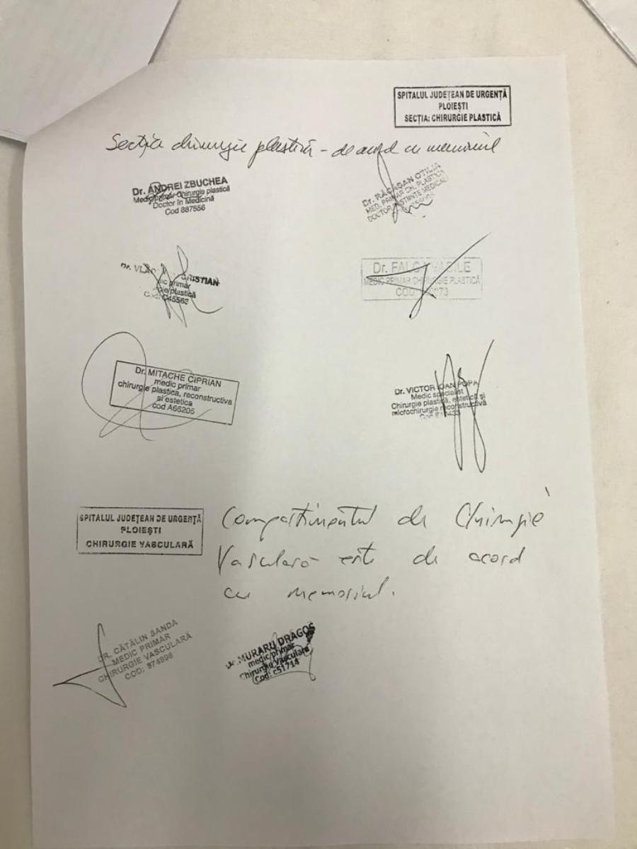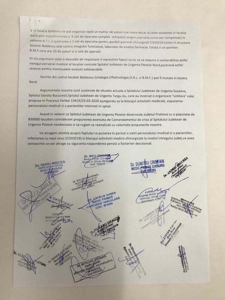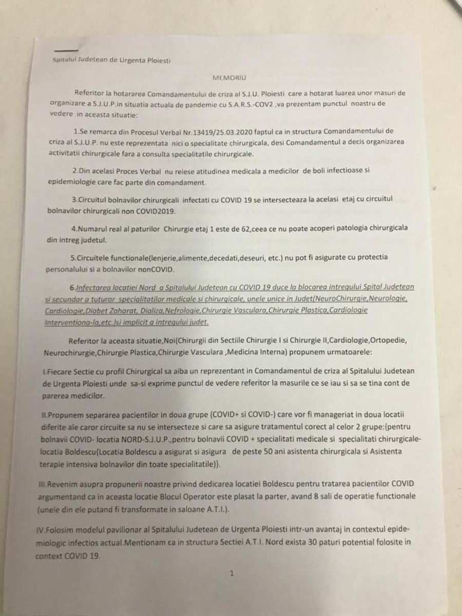 Medicii fac referire, în memoriul redactat și semnat deja de zeci de cadre medicale de la Spitalul Județean, la o hotărâre din 25 martie a comandamentului de criză al SJU Ploiești. Aceștia subliniază că „circuitul chirurgical bolnavi infectați cu COVID-19 se intersectează la același etaj cu circuitul celor nonCOVID-19; numărul real al paturilor Chirurgie – etaj 1 este 62, ceea ce nu poate acoperi patologia chirurgicală din întreg județul; circuitele funcționale (lenjerie, alimente, decedați, deșeuri etc) nu pot fi asigurate cu protecția personalului și a bolnavilor nonCOVID”, în concluzie „infectarea locației Nord a Spitalului Județean cu COVID19 duce la blocarea întregului Spital Județean și secundar a tuturor specialităților medicale și chirurgicale, undele unice în județ (Neurochirurgie, Neurologie, Cardiologie, Diabet zaharat, Dializă, Nefrologie, Chirurgie vasculară, Chirurgie plastică, Cardiologie intervențională etc) și implicit a întregului județ”.