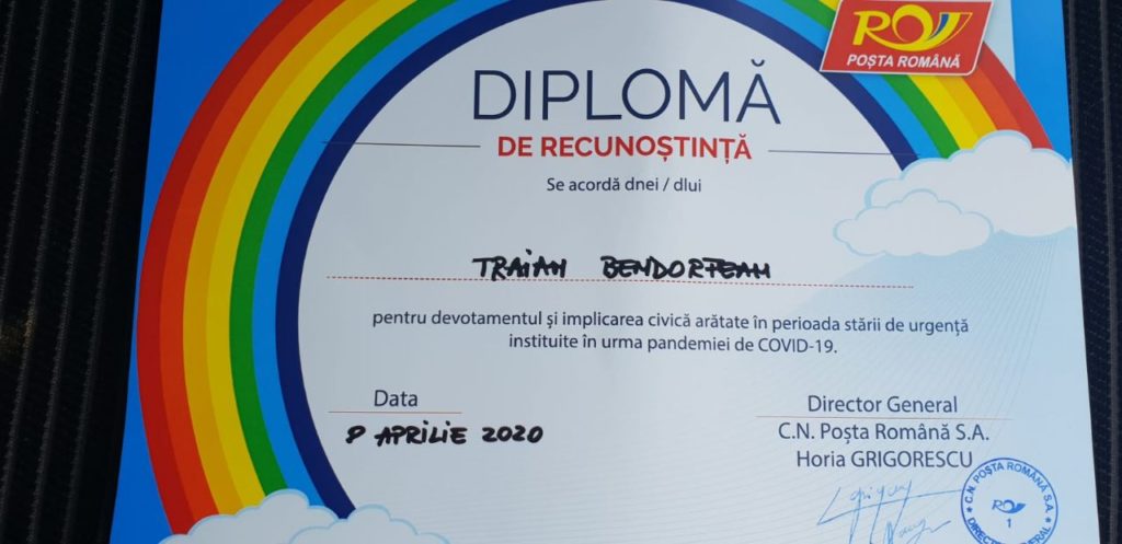 Ieri, poștașii mureșeni i-au dat o diplomă pentru devotamentul și implicarea civică arătate în perioada stării de urgență instituite în urma pandemiei de COVID-19.