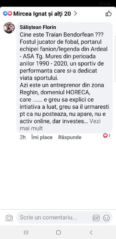 Traian Bendorfean nu este numai un uriaș cu suflet mare și un om foarte discret, nu apare în presă, nu este activ online. Mureșenii îl știu de când juca fotbal, fiind portarul echipei fanion legendă din Ardeal ASA Tg. Mureș din perioada 1990-2020 , un sportiv de performanță, care și-a dedicat viața sportului.
