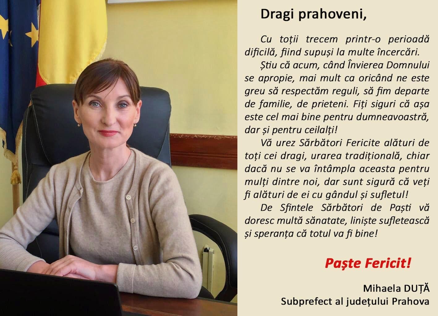 Articolul De Sfintele Sarbatori de Pasti va doresc multa sanatate, liniste sufleteasca si speranta ca totul va fi bine! – Mihaela Duta – Subprefect al judetului Prahova apare prima dată în Ziarul Incisiv de Prahova.