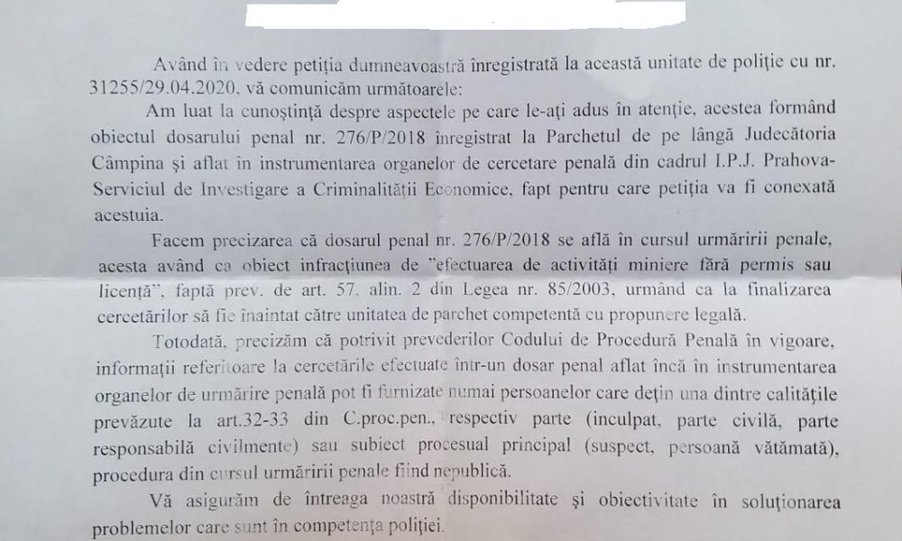 In acest sens ar exista si un dosar penal: D 276/P/2018, pentru activitati miniere, fara licenta.