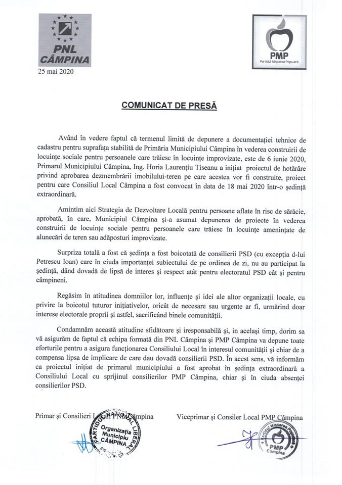 Aveți mai jos un comunicat de la PNL Câmpina, semnat de edil, în calitate de președinte de organizație.