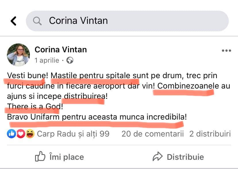 „Din cauză că societatea comercială furnizoare nu a achitat intermediarului nicio sumă din procentul de 18 % convenit , inculpatul Ionel Eugen Adrian, în calitate de director general al C.N. Unifarm S.A a decis rezilierea unilaterală a contractului. Din totalul echipamentelor conţinute în contract a fost livrată şi plătită doar o parte, respectiv 1 milion de măşti (care de altfel nu corespundeau specificaţiilor tehnice) şi 26.000 de combinezoane”, mai transmite DNA.