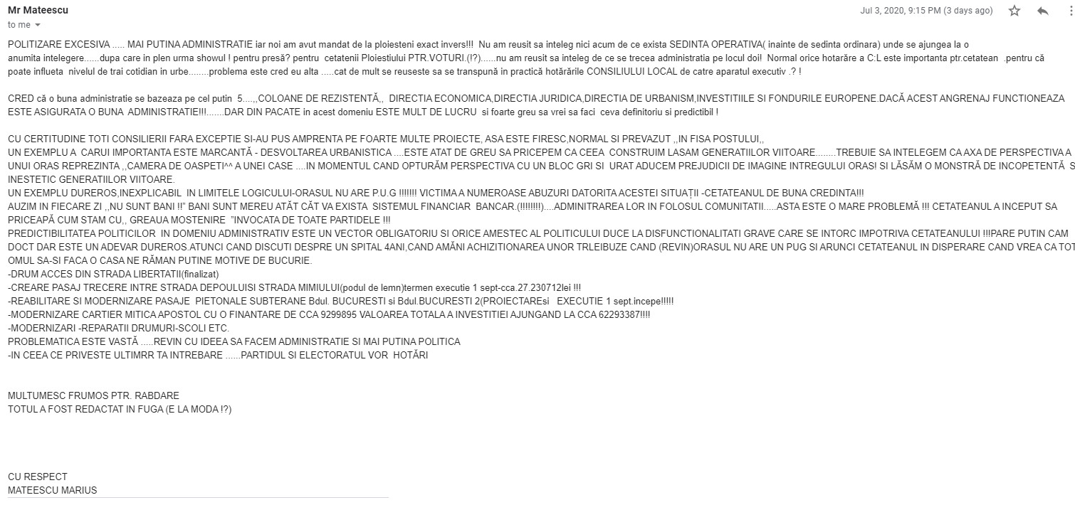 Păcat este că Marius Mateescu se numără printre cei mai experimentați aleși ploieșteni, el având mai multe mandate de consilier la activ. Așa că așteptam altceva de la el…
